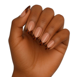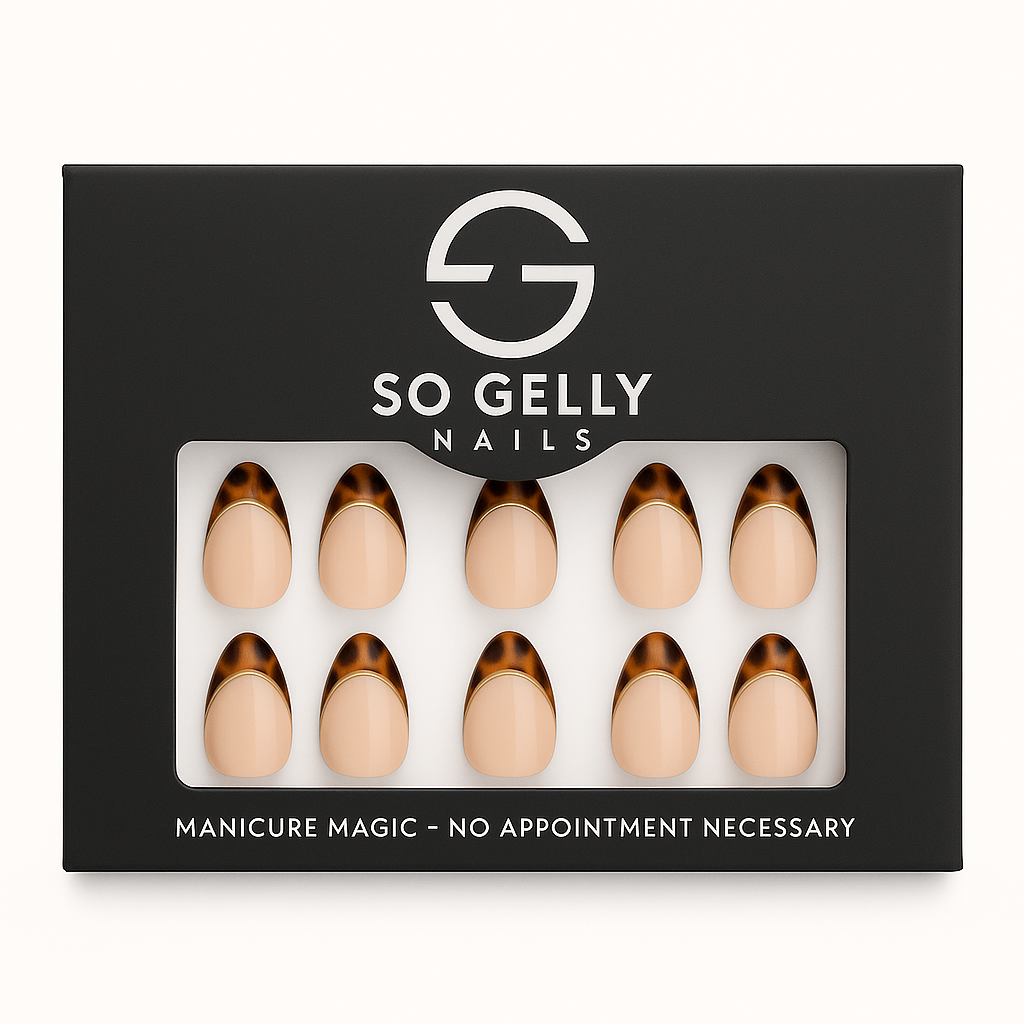Unleash your inner it-girl with Wild Card — the French manicure that plays by its own rules. These short almond nails feature a luxe nude base, bold cheetah-print tips, and a sleek gold metallic trim for just the right amount of edge and elegance.