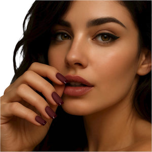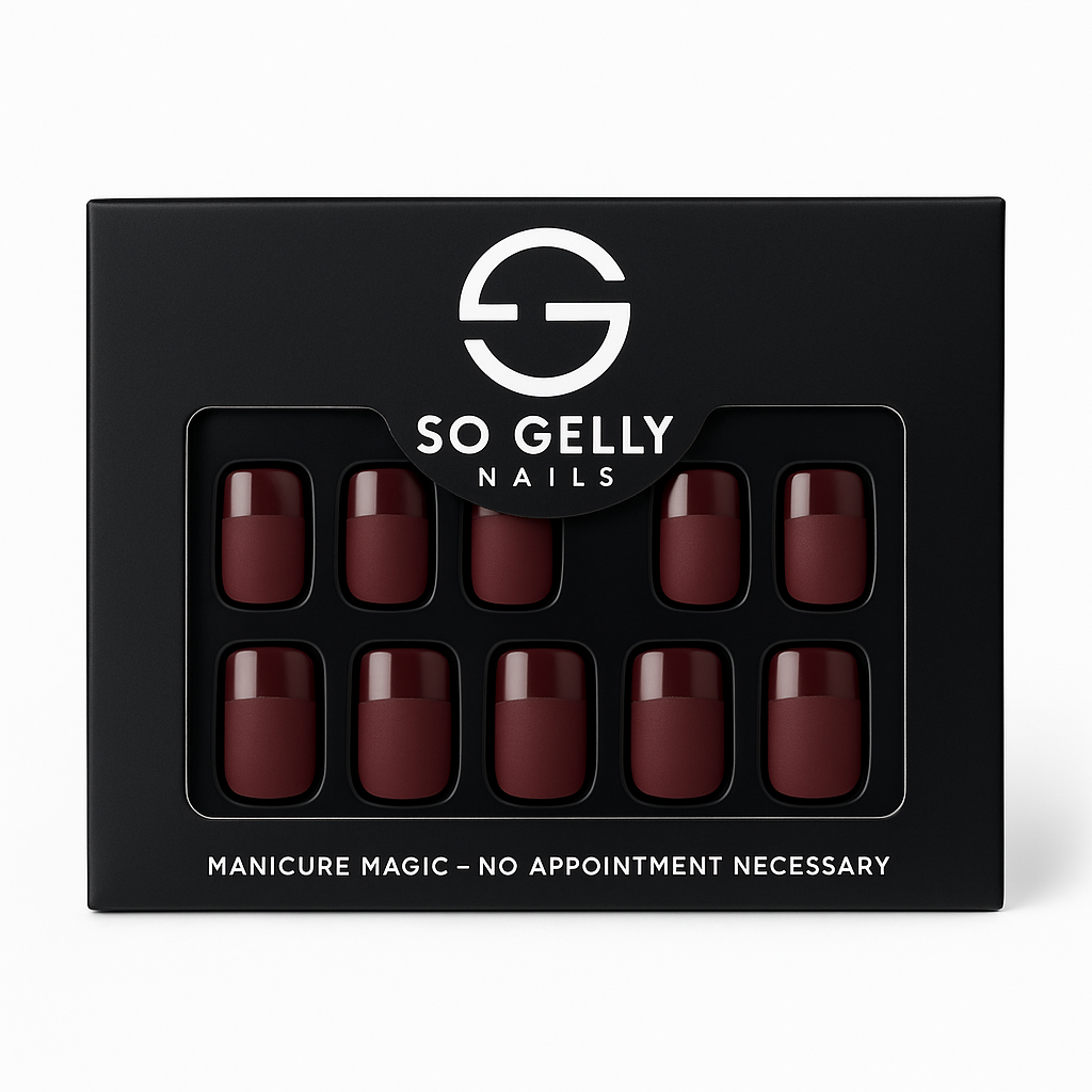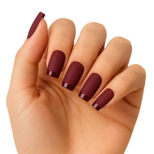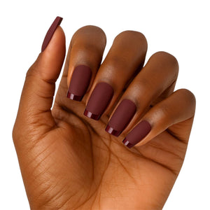 Deep, rich, and effortlessly chic — Wine Down is your cozy-glam moment in a manicure. This short square set features a matte burgundy base paired with a glossy French tip for a modern twist on classic sophistication